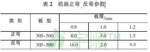 彎弧板機(jī)器正彎、反彎參數(shù),見表2。