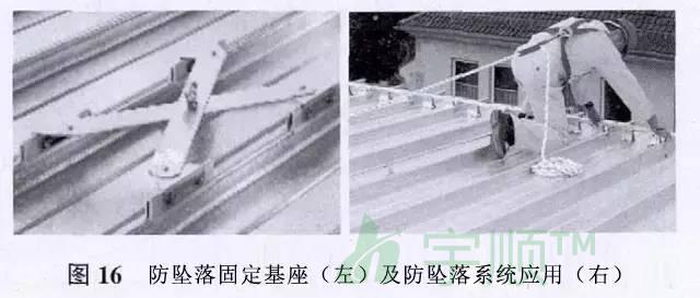 屋面的定期檢查、暴風(fēng)雪后清潔屋面和天溝、屋面改造,這些都需要屋面設(shè)置防墜落系統(tǒng)。防墜落系統(tǒng)包括一個(gè)堅(jiān)固、耐久且靈活的不銹鋼索,該不銹鋼索的每一端連接到屋面固定基座支架上。屋面固定基座使用鋁夾,連接到屋面板上。屋面固定基座被設(shè)計(jì)為減震器,一旦墜落發(fā)生,將變形減弱墜落的震動,并保障基座仍然安全地固定在屋面板上。